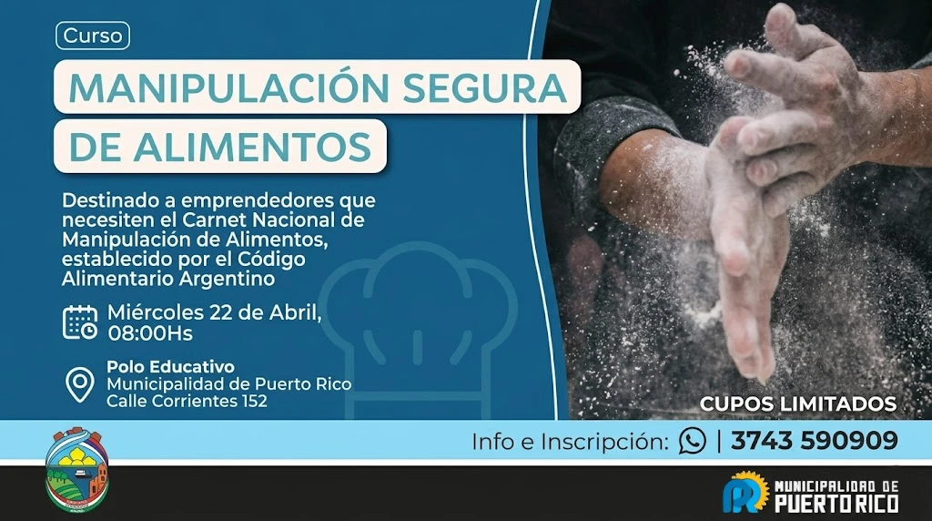 La Municipalidad de Puerto Rico ha anunciado la apertura de inscripciones para un curso de Manipulación Segura de Alimentos. Esta iniciativa está especialmente dirigida a todos aquellos emprendedores que requieran obtener el Carnet Nacional de Manipulación de Alimentos, un certificado obligatorio establecido por el Código Alimentario Argentino.