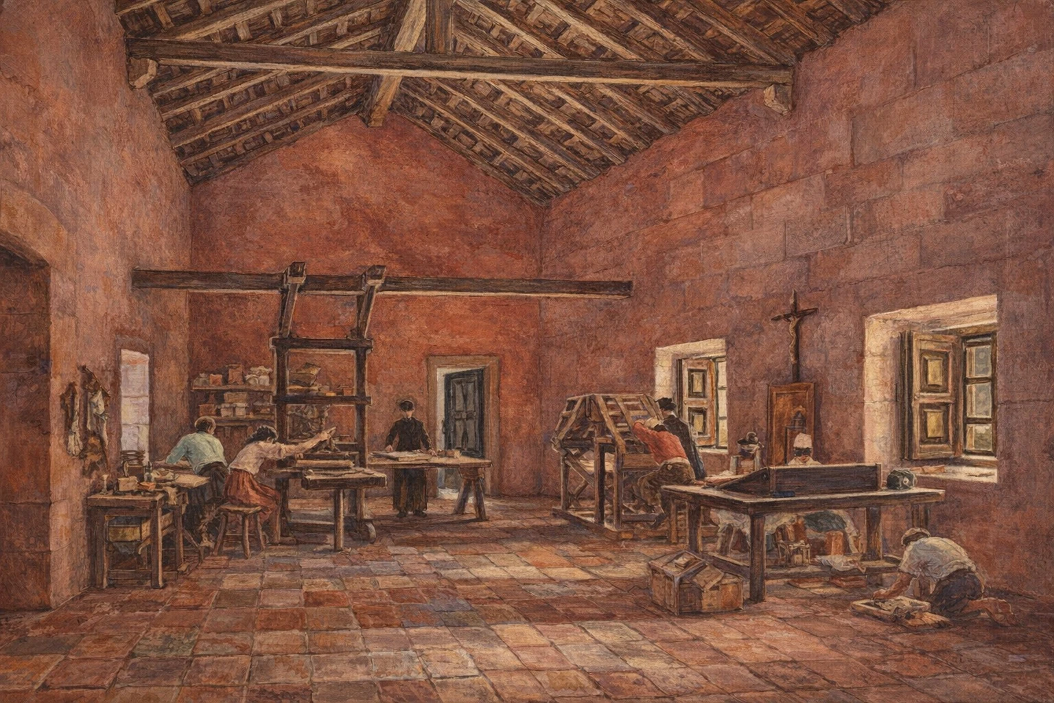 Se emplearon prensas de madera, un material accesible y fácilmente trabajable. Los caracteres tipográficos, elementos esenciales para la impresión, eran fundidos en las propias reducciones a partir de estaño, evidenciando un notable nivel de autosuficiencia y conocimiento técnico. Asimismo, las planchas de cobre utilizadas para la impresión de imágenes o elementos decorativos eran grabadas por indígenas neófitos, quienes aportaron su habilidad artística al proyecto.