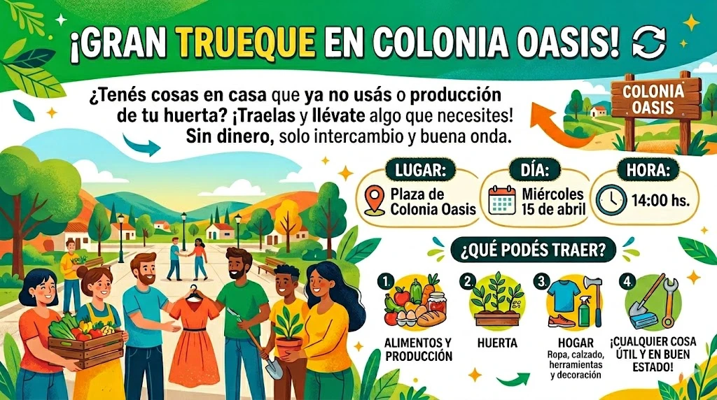 El próximo miércoles 15 de abril, la Plaza de Colonia Oasis será el escenario de una iniciativa que busca fortalecer los lazos entre vecinos y promover un consumo más consciente y sostenible. Bajo el lema "¡GRAN TRUEQUE EN COLONIA OASIS! 🔄", se invita a todos los residentes a participar en un intercambio donde el único medio de transacción será la permuta y la buena voluntad.