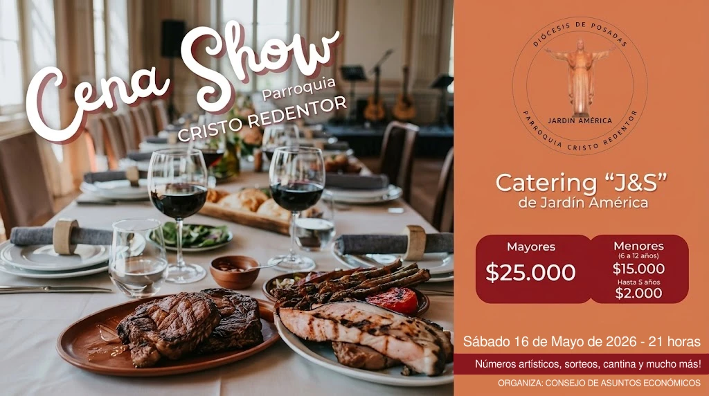 La comunidad parroquial de Cristo Redentor, ubicada en Jardín América y perteneciente a la Diócesis de Posadas, ha anunciado la organización de una Cena Show con fines benéficos. El evento, a cargo del Concejo de Asuntos Económicos, tiene como objetivo principal la recaudación de fondos destinados íntegramente a cubrir los servicios de la parroquia.