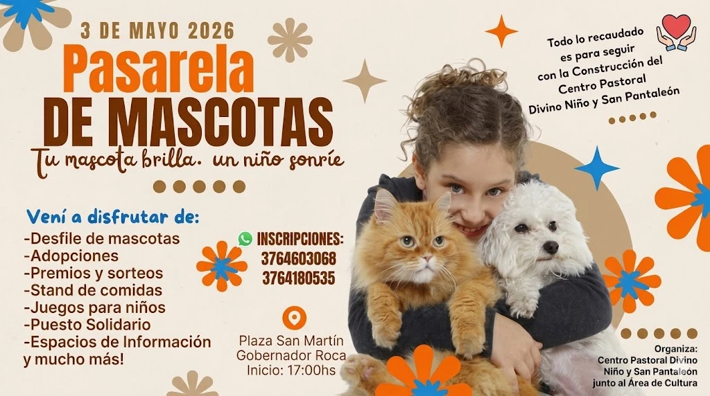 El próximo 3 de Mayo de 2026, la Plaza San Martín de Gobernador Roca será el escenario de un evento sin precedentes: la Pasarela de Mascotas. Bajo el lema "Tu mascota brilla, un niño sonríe", esta iniciativa busca recaudar fondos esenciales para la continuación de la obra del Centro Pastoral Divino Niño y San Pantaleón.