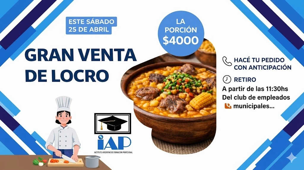 El Instituto Argentino de Formación Profesional (IAP) anuncia con gran entusiasmo la realización de una Gran Venta de Locro Solidaria. Este evento benéfico, organizado íntegramente por los alumnos de la institución, tiene como propósito fundamental la recaudación de fondos necesarios para costear aspectos cruciales de su formación. Entre los objetivos se encuentran la financiación de sus ambos de práctica, el desarrollo de actividades en las escuelas donde realizan sus pasantías, y la organización del esperado acto de fin de año.